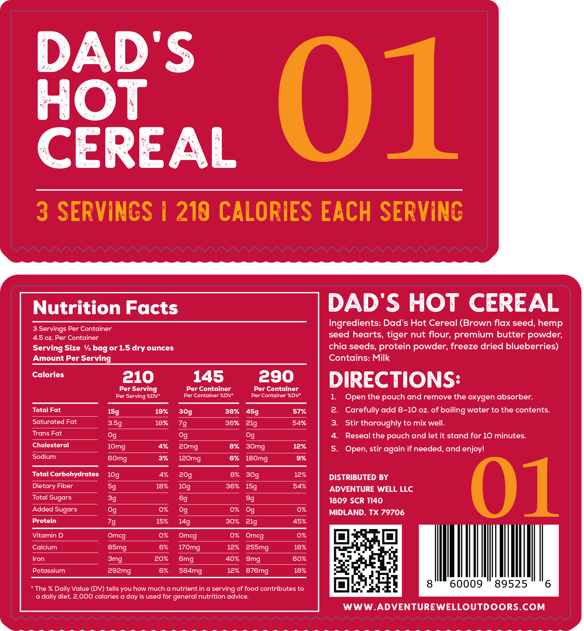 Dad's Hot Cereal, a hearty blend of wholesome ingredients designed to kickstart your day with a burst of natural energy. Crafted by Adventure Well Outdoors, this nutrient-packed cereal is a delicious and nutritious way to fuel your adventures.