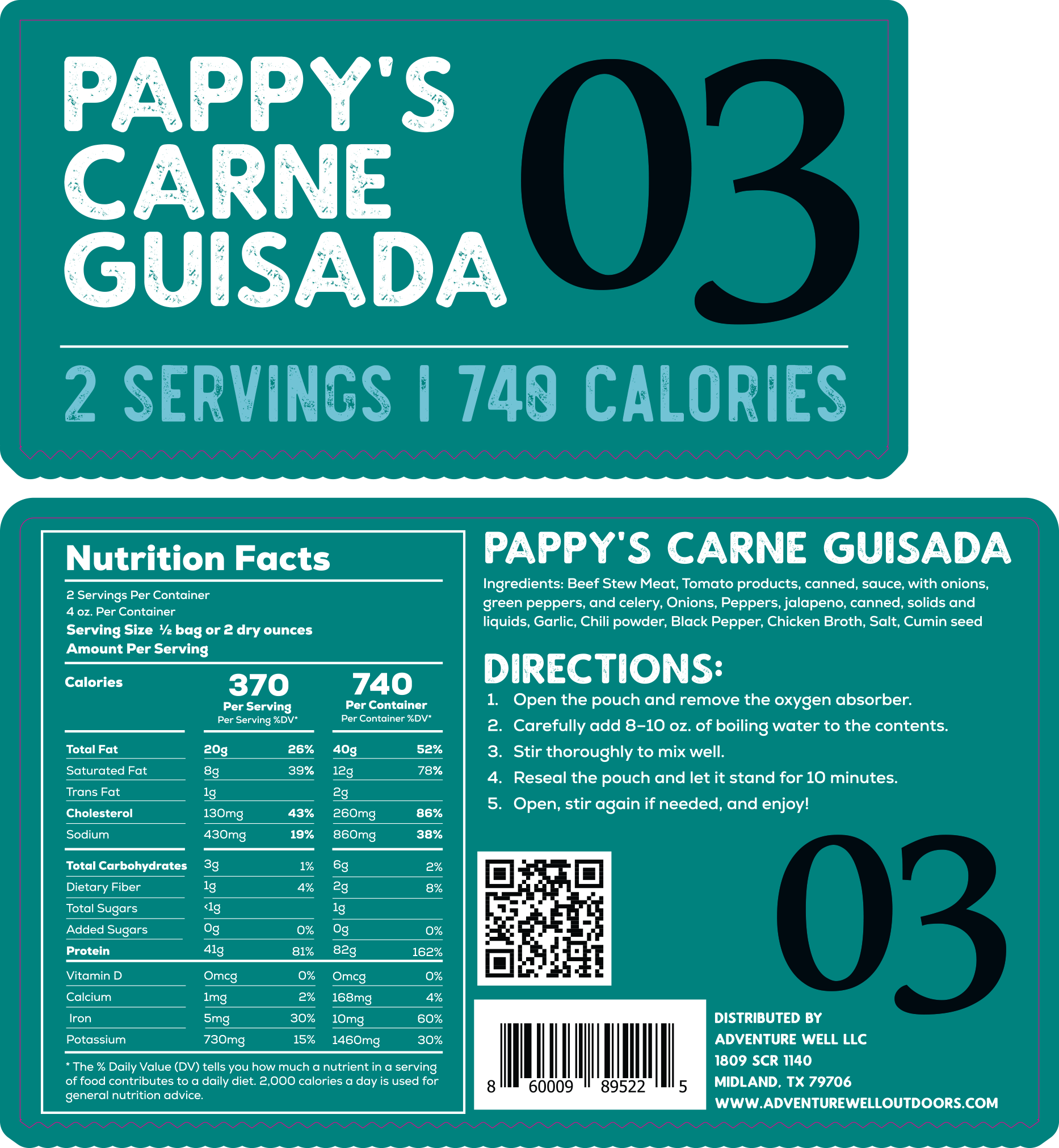 Embark on a culinary journey with Pappy's Carne Guisada by Adventure Well Outdoors—a fiery and authentic Tex-Mex stew meticulously crafted for adventurers seeking a taste of the wild. This spicy sensation is fueled by premium Akaushi beef stew meat and a vibrant medley of fresh ingredients, promising to ignite your taste buds and energize your outdoor escapades.